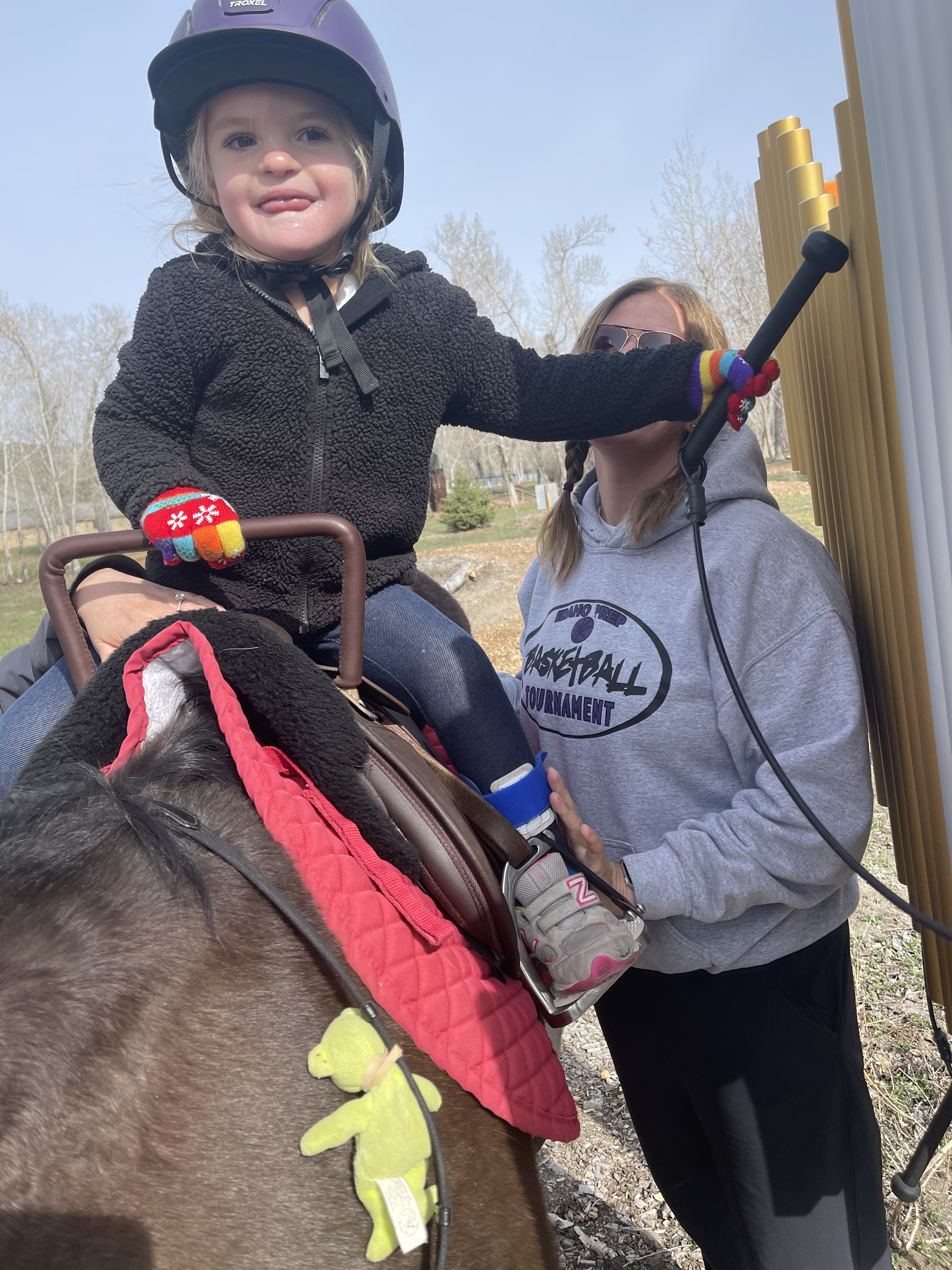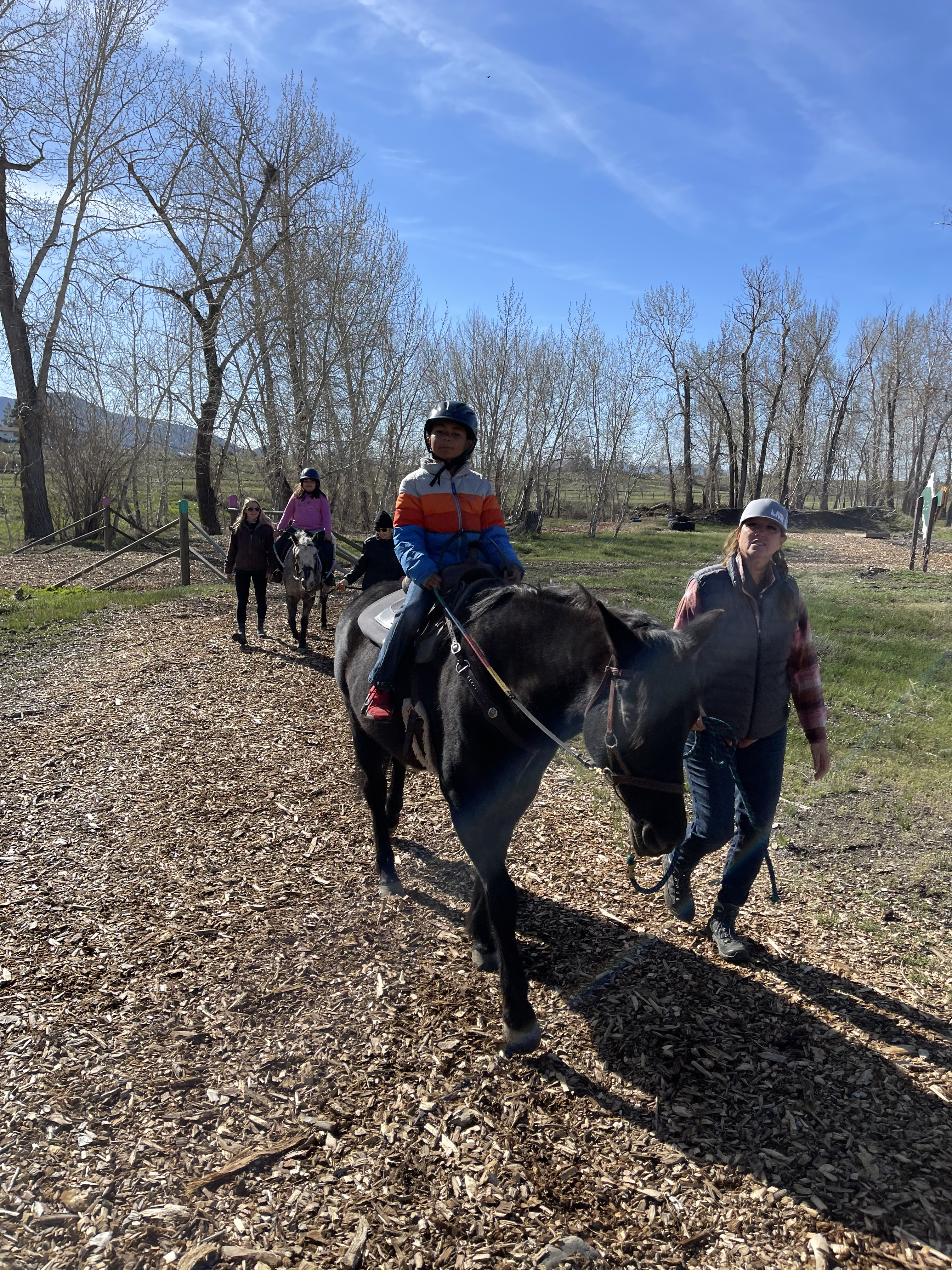 Whoa, this spring has been a bit weird, at least weather-wise. March, which seemed warmer than average, with many days of bright blue skies, really didn’t live up to the whole “in like a lion, out like a lamb” saying. And then April rolled in with a nice warm welcome and quickly changed to cold days filled with precipitation. So, maybe April was doing its best to hold true with “April showers bring May flowers.” While April wasn’t exactly what we expected and we had many days of riding the arena, it did bring us some moisture that we were in desperate need of. Let’s hope it’ll help hold up against the drought! But, because of April’s moisture, the ranch is starting to green up and we’re enjoying days out on the sensory trail with our lessons. Fresh air, horseback riding, and great company – really, what more could you ask for?